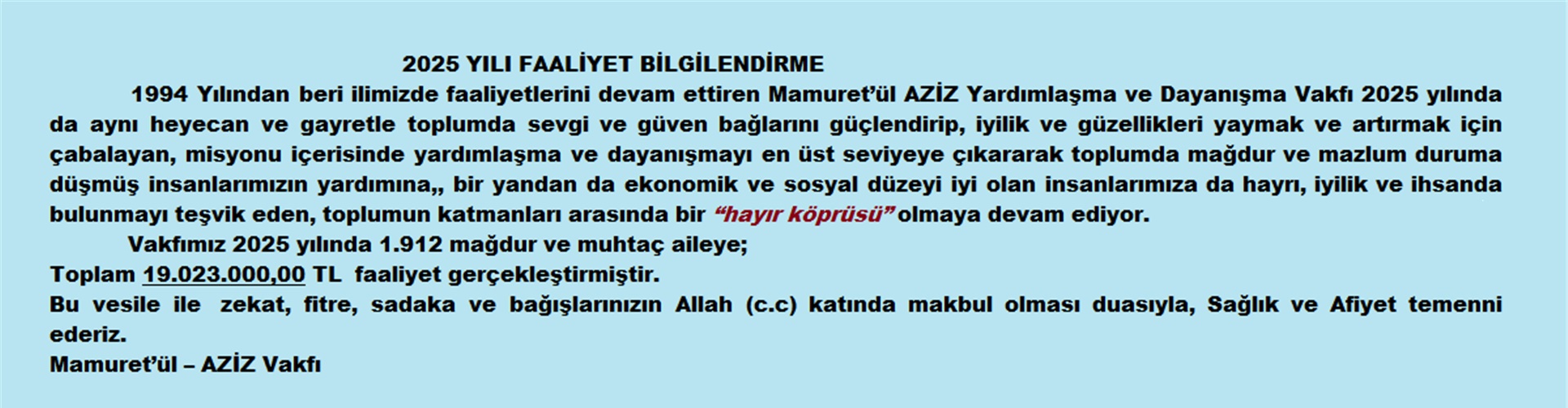 2025 YILI FAALİYET BİLGİLENDİRME 1994 Yılından beri ilimizde faaliyetlerini devam ettiren Mamuret’ül AZİZ Yardımlaşma ve Dayanışma Vakfı 2025 yılında da aynı heyecan ve gayretle toplumda sevgi ve güven bağlarını güçlendirip, iyilik ve güzelli